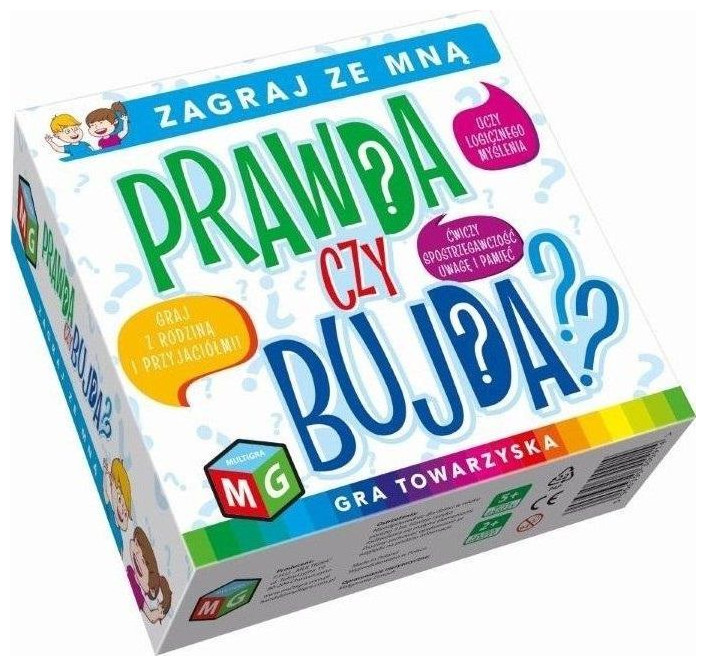 Είναι ένα παιχνίδι πάρτι που μπορείτε να παίξετε με την οικογένεια και τους φίλους σας. Είναι ένα χαλαρωτικό παιχνίδι με μια νότα χιούμορ που διδάσκει λογική σκέψη, ασκεί οξυδέρκεια, προσοχή και μνήμη και είναι μια ευχάριστη διαφοροποίηση του ελεύθερου χρόνου. Ο στόχος του παιχνιδιού είναι να συλλέξει όσο το δυνατόν περισσότερες «αληθινές» ή «ανοησίες». . Αυτός που το κάνει αυτό γίνεται ο νικητής. Το παιχνίδι μπορεί να παιχτεί ομαδικά και ατομικά. Οι ακόλουθες ενότητες του εγχειριδίου περιέχουν περιγραφές και των δύο παραλλαγών. Περιεχόμενα κουτιού: κουτιά "Truth" - 30 τμχ, κουτιά "bujda" - 30 τμχ, οδηγίες.{Age} Δεν υπάρχουν διαθέσιμα δεδομένα. {Game time} Δεν υπάρχουν διαθέσιμα δεδομένα. {Διαθέσιμα πρόσθετα} Όχι. {Αριθμός παικτών} Δεν υπάρχουν δεδομένα