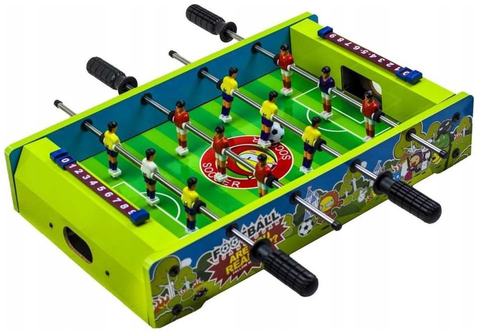 Μια τέλεια πρόταση για όλη την οικογένεια, θα ευχαριστήσει τόσο τα παιδιά όσο και τους μεγάλους. Ταιριάζει σε οποιοδήποτε γραφείο ή τραπέζι και χάρη στις συμπαγείς διαστάσεις του είναι εύκολο να αποθηκευτεί. Παράμετροι: Συμπαγής κατασκευή από ξύλο και σανίδα 2 μπάλες παιχνιδιού Περιλαμβάνονται προστατευτικά στοιχεία στις άκρες των ράβδων Αντιολισθητικές λαβές Φιγούρες παίκτη από ανθεκτικό πλαστικό Διαστάσεις: 51 x 31 x 10 cm Βάρος προϊόντος: 2,6 kg.{Υλικό} Πλακέτα MDF