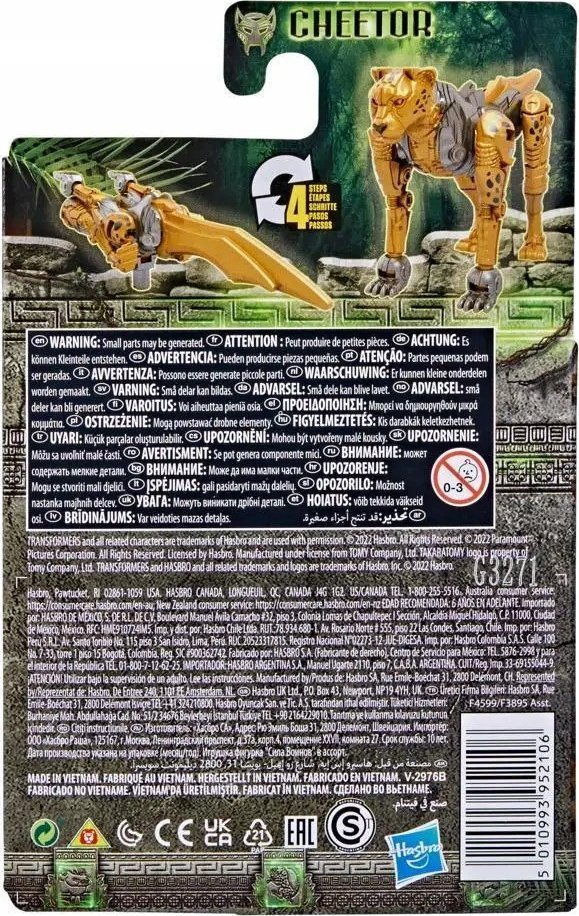 HASBRO Figurka Transformers CheetorFIGURKA TRANSFORMERS ROTB BATTLE MASTER CHEETOR Figurka inspirowana najnowszym filmem ze świata Transformers - "Transformers: Przebudzenie Bestii "! Zmień figurkę w broń, wykonując kilka prostych ruchów, a następnie użyj jej, aby uzbroić inne figurki i przygotować się do epickich bitew! Figurka ma 8 cm wysokości.Nr katalogowy: F3895/F4599 Marka: Transformers Typ: Akcji,Bajkowe Wariant: Figurka Wymagania wiekowe: 6 lat Materiał: Tworzywo sztuczne Płeć: Chłopcy Produkt na baterie: Nie Baterie w zestawie: Nie Zasilanie : Nie dotyczy Wysokość: 6 cm
