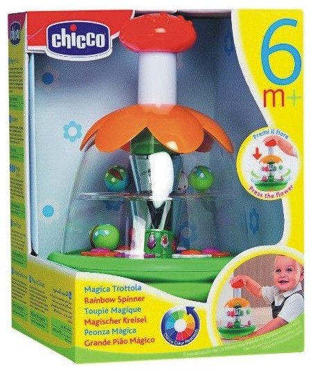 Το Spinning Top Chicco Rainbow υποστηρίζει την ανάπτυξη του παιδιού. Το παιδί πιέζει τη λαβή, θέτοντας τον μηχανισμό σε κίνηση. Στη συνέχεια η περιστρεφόμενη κορυφή αρχίζει να περιστρέφεται και οι μπάλες μέσα αρχίζουν να κινούνται. Με αυτόν τον τρόπο, το παιδί αρχίζει να κατανοεί τη σχέση αιτίου και αποτελέσματος.