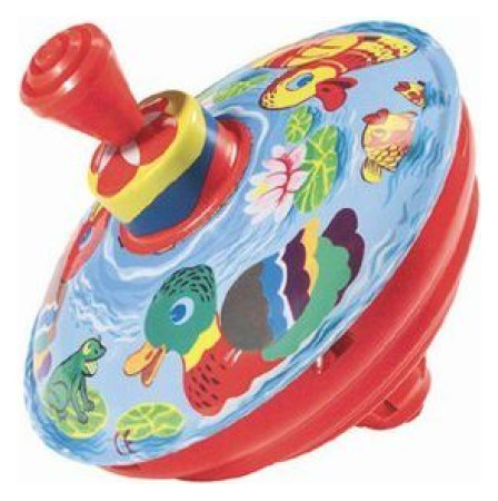 Śliczny bąk grający z rysunkiem małych kaczuszek, o średnicy 13 cm. Zabawka podczas kręcenia wydobywa z siebie dźwięki o różnych tonach w zależności od szybkości kręcenia. Ta od pokoleń znana zabawka, w wyjątkowo atrakcyjnej odsłonie, zaciekawi każde dziecko. Zawiera podstawkę. Zabawka przeznaczona dla dzieci w wieku od 18 miesiąca życia.