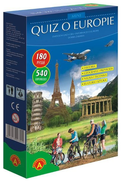 Το Κουίζ για την Ευρώπη mini είναι ένα συναρπαστικό παιχνίδι και μεγάλη διασκέδαση κατά τη διάρκεια του οποίου οι συμμετέχοντες απαντούν σε ερωτήσεις σχετικά με την Ευρώπη. Οι παίκτες μπορούν να απαντήσουν σε 180 ερωτήσεις από 45 κάρτες και να έχουν 540 απαντήσεις για να διαλέξουν. Τα θέματα ερωτήσεων και απαντήσεων περιλαμβάνουν: ιστορία, γεωγραφία και φύση, επιστήμη και τεχνολογία και ευρωπαϊκό πολιτισμό και τέχνη. Είναι ελκυστική και συναρπαστική ψυχαγωγία για όλη την οικογένεια και οι συμμετέχοντες μπορούν να επεκτείνουν τις γνώσεις τους για την Ευρώπη ενώ παίζουν: 45 κάρτες με ερωτήσεις και απαντήσεις, παιχνίδι που προορίζεται για: 2 έως 3 παίκτες ηλικίας άνω των 10 ετών.