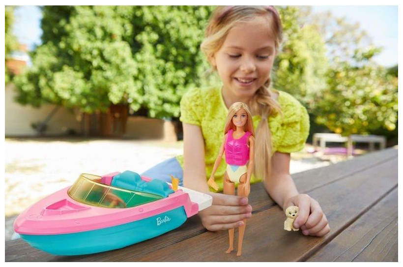 Δημιουργήστε τις δικές σας θαλάσσιες ιστορίες με ένα ταχύπλοο Barbie που επιπλέει στο νερό, συν μια κούκλα Barbie και ένα κουτάβι.