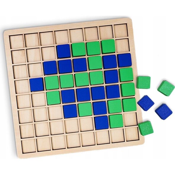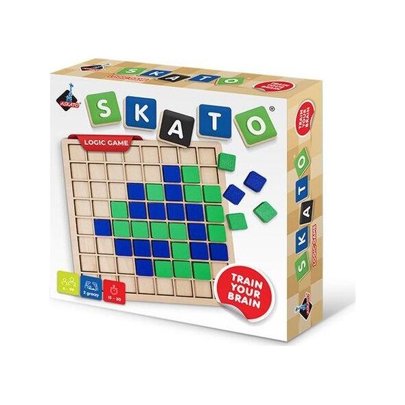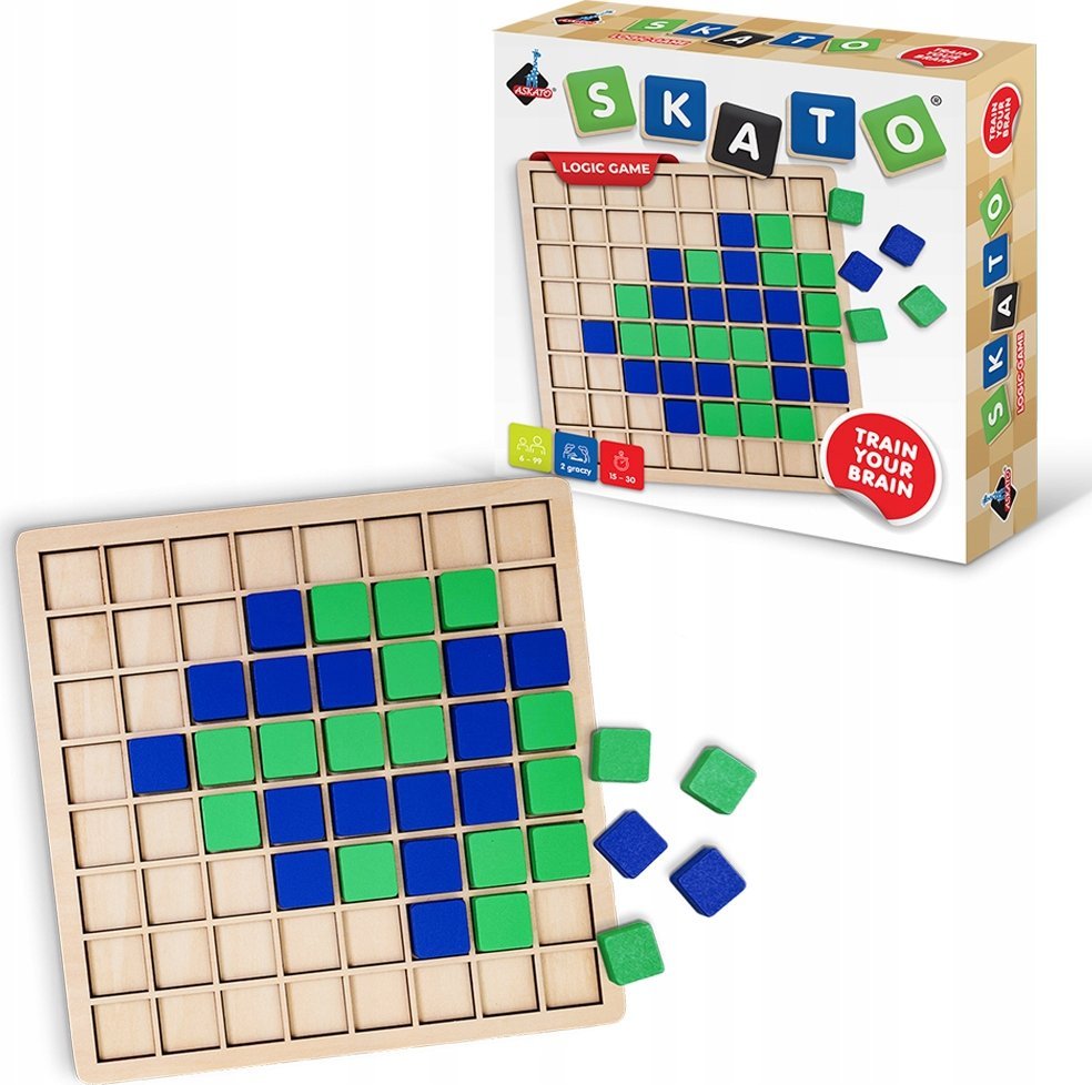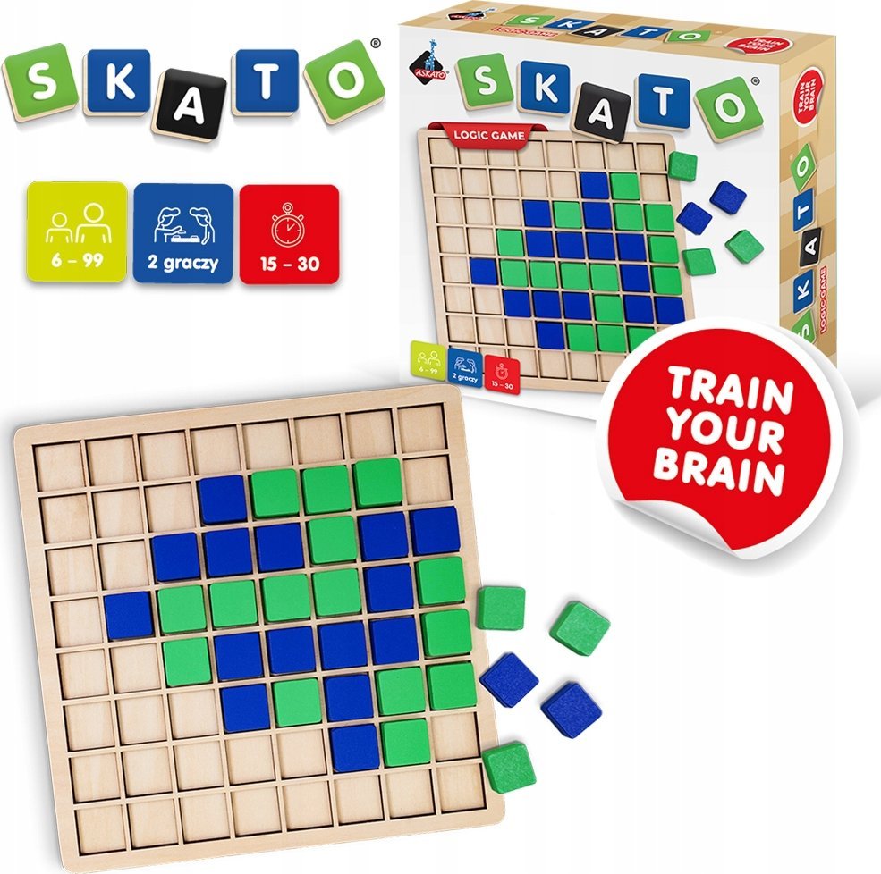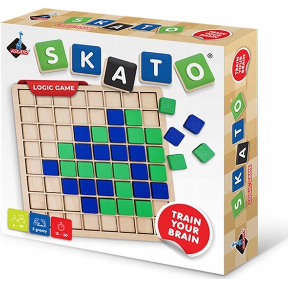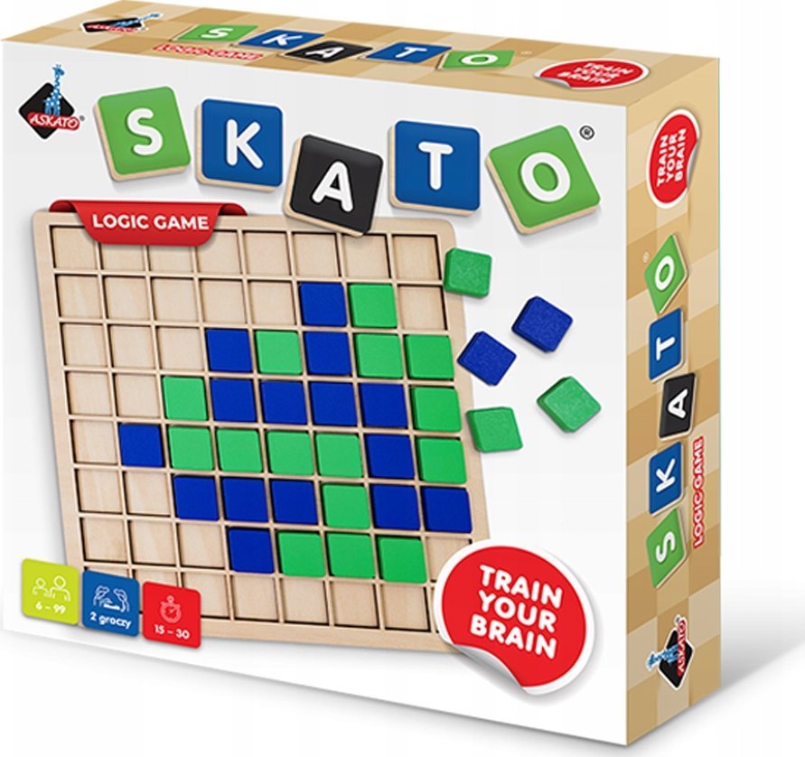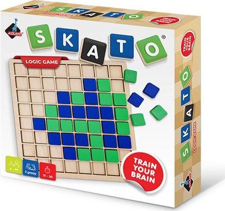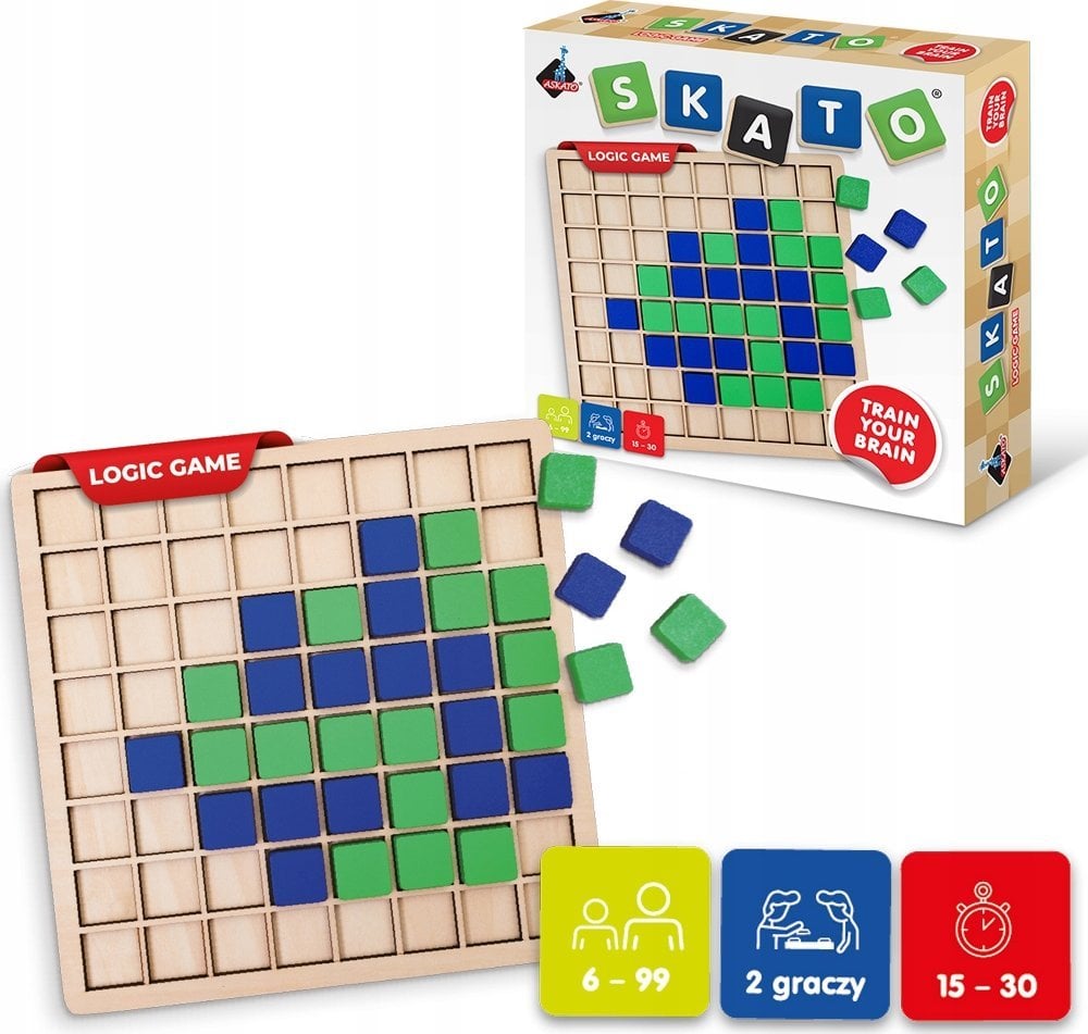 DREWNIANA GRA LOGICZNA SKATO LOGIC GAME Jest to genialnie prosta w swoich zasadach gra logiczno-strategiczna, a opanowanie jej reguł zajmuje mniej niż 10 minut. Gra toczy się pomiędzy dwoma przeciwnikami, którzy nie tylko muszą planować strategię swoich ruchów, ale również przewidywać ruchy przeciwnika (by nie zostać pokonanym przed zakończeniem rozgrywki). SKATO stanowi również świetny trening szarych komórek a przy okazji pozwala rozegrać wiele przyjemnych sparingów umysłowych między graczami w różnym wieku i o różnym planszowym doświadczeniu.Ta niezwykle pasjonująca gra zainteresuje zarówno dzieci jak i ich rodziców bądź opiekunów a pokoleniowe umysłowe potyczki staną się niezmiennym elementem wspólnego spędzania czasu. Podczas gry w SKATO dziecko nabywa i rozwija umiejętności logicznego myślenia, koncentracji, strategii, opanowania emocji i chłodnej analizy, natomiast dorosły gracz umiejętności te utrwala a senior dzięki nim opóźnia proces demencji Gra polega na ułożeniu przez graczy swoich pionków na planszy w taki sposób, aby pionki tego samego koloru, które przylegają do siebie chociaż jednym bokiem, utworzyły jak największą powierzchnię.Każdemu z graczy przypisany jest jeden kolor pionków. Grę rozpoczyna jeden z graczy ustawiając swój pionek w dowolnym miejscu na planszy, a następnie drugi gracz dokłada swój pionek tak, aby jednym bokiem sąsiadował z pierwszym pionkiem przeciwnika. Potem gracze ustawiają swoje pionki naprzemiennie aż do zapełnienia całej planszy, starając się zbudować jak największe pole sąsiadujących pionków własnego koloru. Podczas układania pionków zachowujemy zasadę, że dokładany pionek musi graniczyć minimum jednym bokiem z dowolnym pionkiem znajdującym się już na planszy.Nieprawidłowym jest ruch polegający na dołożeniu pionka stykającego się z innym pionkiem tylko rogiem. Dopuszczalne jest układanie kilku niepołączonych ze sobą pól, ale do końcowej punktacji wliczają się tylko te pola, które składają się z minimum 5 pionków. Grę kończy się po zapełnieniu wszystkich pól na planszy i ułożeniu wszystkich pionków. Wiek: 6+ lat