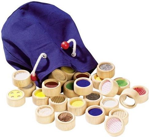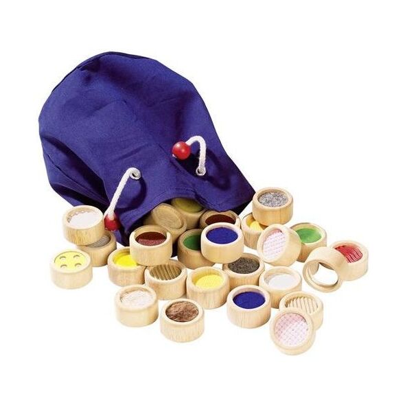 Βρείτε 2 πανομοιότυπα αντικείμενα σε μια βαμβακερή τσάντα! Χάρη στις διαφορετικές υφές των ξύλινων στοιχείων, το παιχνίδι διεγείρει την αντίληψη.