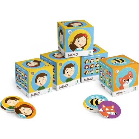 Μίγμα σχεδίων, προϊόντα που αποστέλλονται τυχαία, δημιουργήθηκαν παιχνίδια DODO ειδικά για τους νεότερους. Μπορούν να τα απολαύσουν τόσο τα νήπια όσο και τα νήπια. Η πληθώρα μοτίβων και χρωμάτων εκπλήσσει. Περιλαμβάνουν διάφορα κύρια θέματα με τη μορφή πολύχρωμων εικονογραφήσεων Το παιχνίδι Memo είναι πολύ διασκεδαστικό για τους νεότερους, σε συνδυασμό με την εκπαίδευση, την υπομονή και τη συγκέντρωση των καρτών. Αναποδογυρίστε οποιαδήποτε δύο φύλλα. Αν είναι ζευγάρι, πάρε τα. Αν όχι, γυρίστε τα πίσω με την όψη προς τα κάτω. Θυμηθείτε τι υπήρχε σε κάθε κάρτα. Το παιχνίδι τελειώνει όταν όλα τα φύλλα έχουν αντιστοιχιστεί. Ο παίκτης με τα περισσότερα ζευγάρια κερδίζει!Διάφορα θεματικά σύνολα για να διαλέξετε: Δεινόσαυροι, Ζώα, Συναισθήματα, Μούρα, Φρούτα και Λαχανικά και Άγρια Ζώα Ηλικία 3+, Το σετ περιέχει: 24 στοιχεία.