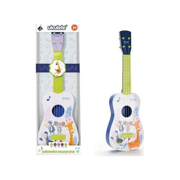 Gitara (60 cm) z 4 nylonowymi strunami, wykonana z plastiku z kolorowym nadrukiem (motyw zwierząt afrykańskich).Wymiary opakowania: 20.5 x 7 x 60 cmWiek: 3+