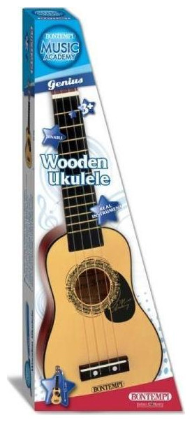 Το Ukulele από το Bontempi είναι ξύλινος εξοπλισμός αφιερωμένος στα μικρότερα παιδιά που ξεκινούν την περιπέτειά τους μαθαίνοντας να παίζουν διάφορα όργανα. Το γιουκαλίλι παράγει έναν ρεαλιστικό ήχο. Το σετ περιλαμβάνει και ένα πλεκτό, μια συσκευή με την οποία μαδάμε τις χορδές.