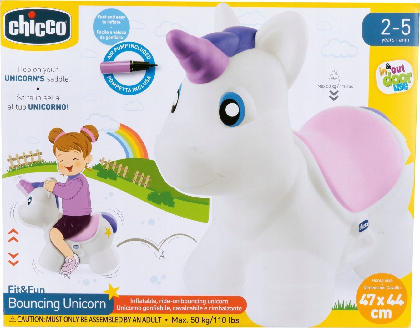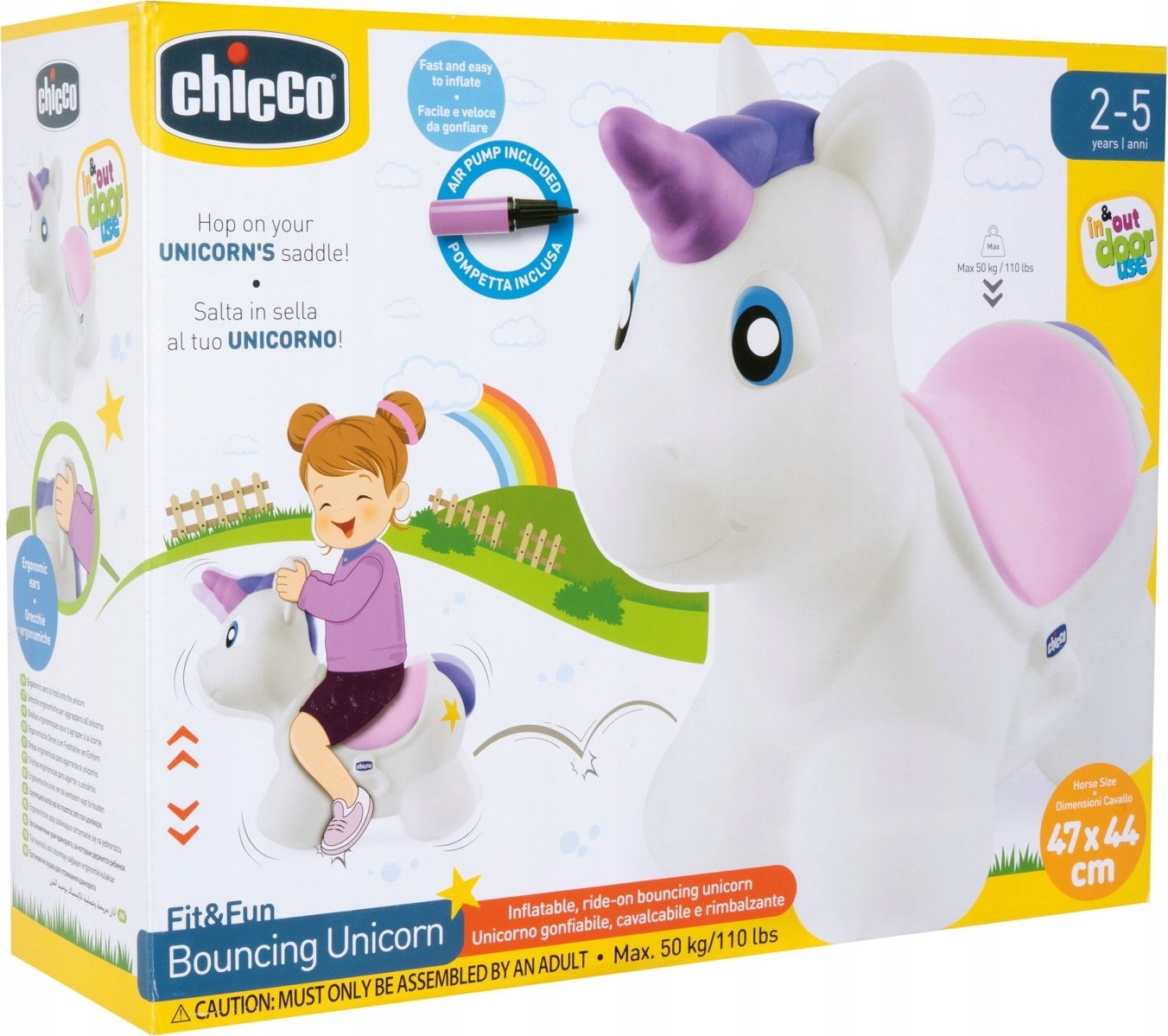 Skoczek Jednorożec CHICCO FIT&FUN z pompką 2+ SKOCZEK JEDNOROŻEC - pierwszy dmuchany skoczek Chicco, zapewniające dziecku niesamowitą zabawę! Skacz i baw się aktywnie. Cechy produktu: Postać JEDNOROŻCA Łatwe i szybka do nadmuchania za pomocą dołączonej ręcznej pompki. Rozwija umiejętności równowagi i koordynacji. Skoczek świetnie sprawdzi się również jako zabawka outdoorowa. Charakterystyczny unikalny design. Grupa wiekowa: 2-5L Wymiary zabawki: 48,5x23x43 cm