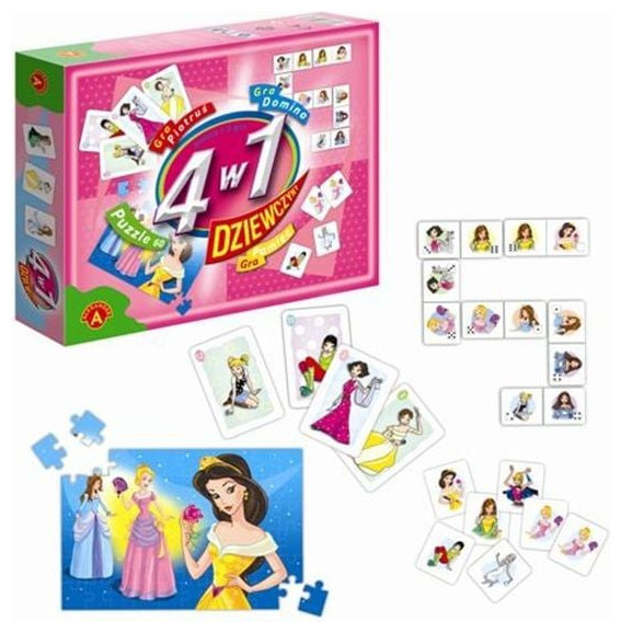 Το "4 in 1 - Girls" είναι ένα σετ από 3 διαφορετικά παιχνίδια και 60 παζλ. Όλα τα παιχνίδια και τα παζλ συνδέονται με γραφικά που απευθύνονται σε κορίτσια. Η φύση των παιχνιδιών ποικίλλει. Το απλό παιχνίδι τράπουλας «Peter» θα προκαλέσει το μεγαλύτερο ενδιαφέρον στους νεότερους. Το παιχνίδι "Μνήμη" είναι μια καλή εκπαίδευση μνήμης για όλους. Το «ντόμινο» είναι επίσης καθολικό, τόσο οι ενήλικες όσο και τα παιδιά απολαμβάνουν να το παίζουν. Τα παζλ είναι μια εξαιρετική άσκηση στην αντίληψη, την υπομονή και τη συγκέντρωση.