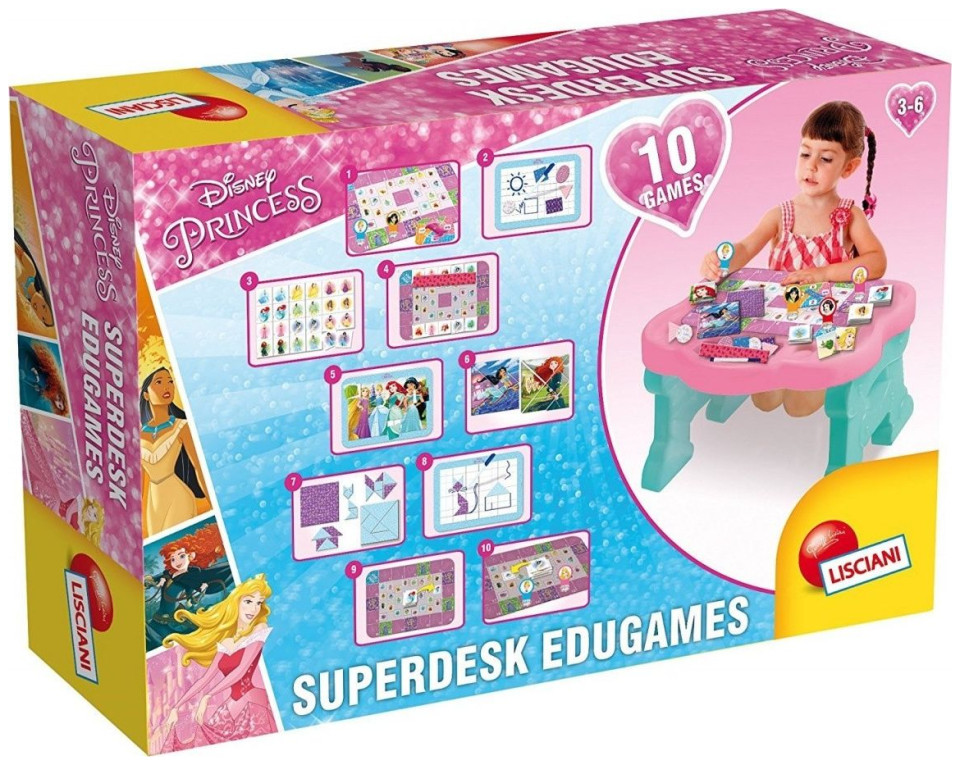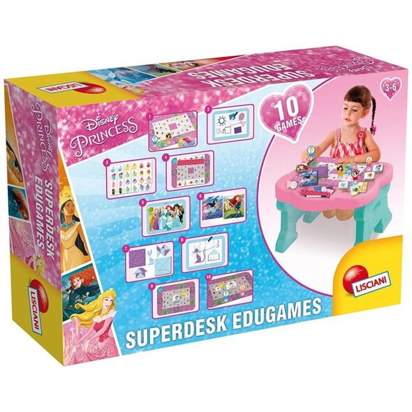 Superbiurko edukacyjne Princess Biurko edukacyjne z księżniczkami z Disneya to super zabawka do nauki i zabawy! Ten edukacyjny zestaw zawiera stolik dziecięcych rozmiarów i 10 gier edukacyjnych wśród których znajdziemy w to grę planszową, memorię, tangramy, puzzle oraz gry rozwijające uwagę. Dzięki dwustronnemu blatowi biurka, z zestawu można także korzystać jak z suchościeralnej tablicy, a do zestawu dołączono również pisak i gąbkę. EAN: 8008324058907 Gwarancja: 24 miesiące Kod dostawcy: 304-58907 Nr katalogowy: 304-58907 Marka: Księżniczki Disneya Rodzaj: Edukacyjne Liczba graczy: Bez ograniczeń Wersja językowa: Polska Wymagania wiekowe: od 3 lat Płeć: Dziewczynki Produkt na baterie: Nie Baterie w zestawie: Nie Zasilanie: Nie dotyczy Akcesoria w zestawie: Pisak Gąbka Pozostałe parametry: Wymiary opakowania: 58.8 x 38.8 x 12.7 cm