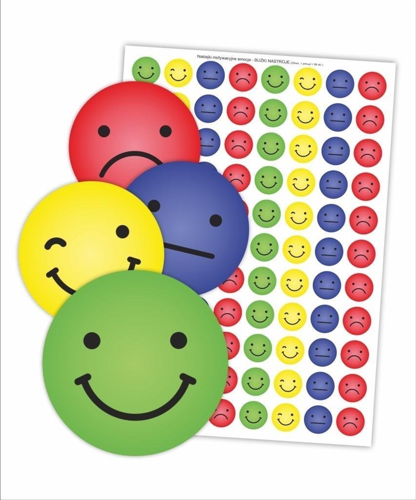 NAKLEJKI MOTYWACYJNE - BUŹKI NASTROJE(średnica 20mm, zestaw 88 naklejek) Zestaw 88 naklejek z buźkami o różnych nastrojach i kolorach!Świetnie sprawdzą się w szkole jako nagroda za dobrze wykonane zadanie czy też dobre zachowanie, a także upomnienie za złe zachowanie.Dzieci poczują się bardziej zmotywowane i docenione za samodzielnie lub grupowe wykonane prace. Naklejki będą przypominać dzieciom o dobrym zachowaniu oraz motywować ich do bycia grzecznym.Mogą służyć jako oceny dla dzieci w wieku przedszkolnym lub wczesnoszkolnym. Naklejki o średnicy 20mm, wydrukowane na papierze matowym.