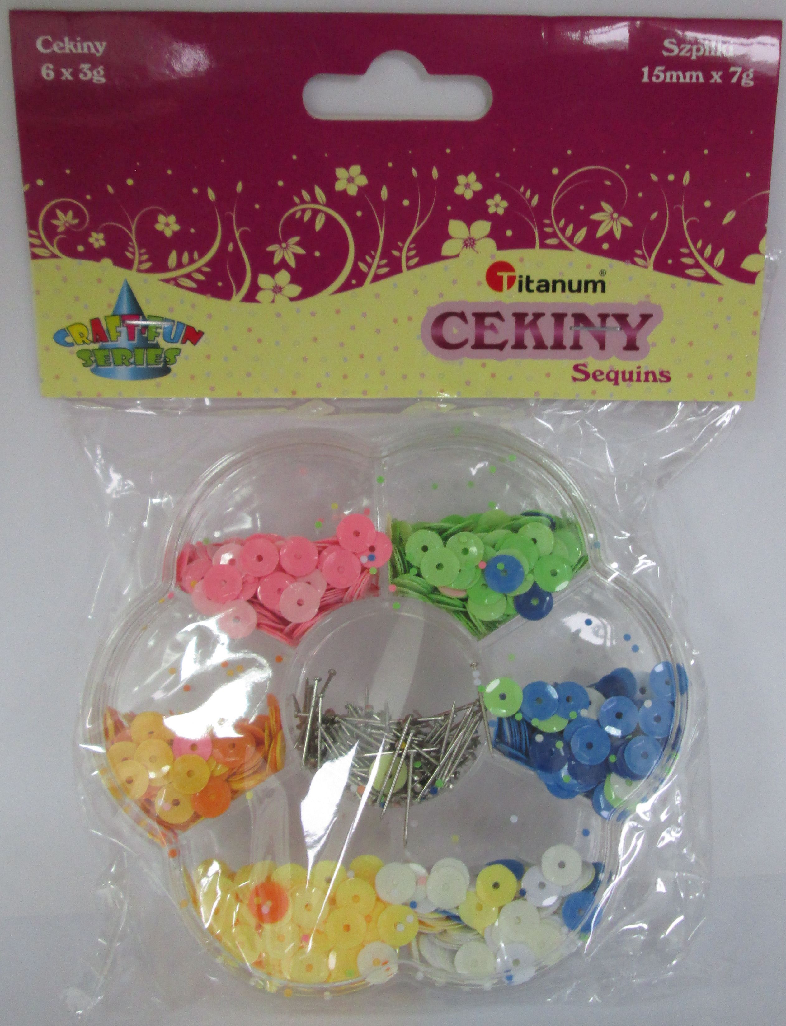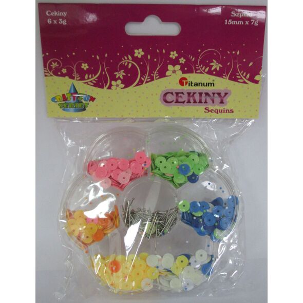 Zestaw zawiera różnokolorowe cekiny 6 x 3 g. i szpilki 1,5 cm.
