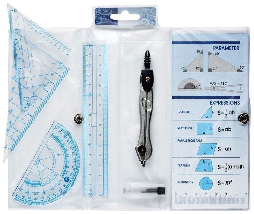 Ένα σετ σχεδίασης που περιέχει πυξίδα, χαρακτήρες, 2 σετ τετράγωνα, χάρακα 15 εκ. και μοιρογνωμόνιο.{Type} Σετ . {Length} Δεν ισχύει