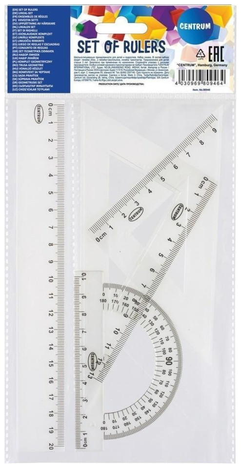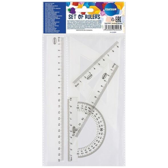 Γεωμετρικό σετ από πλαστικό, περιλαμβάνει χάρακα 20 εκ., 2 χάρακες και μοιρογνωμόνιο.
