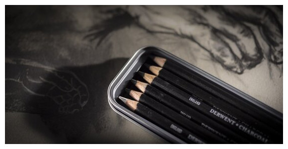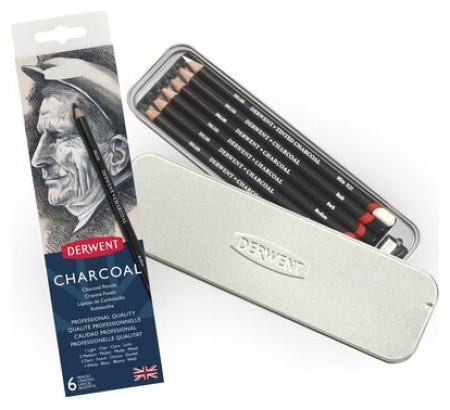 Derwent Charcoal - 6stk tin - Μολύβια κάρβουνου ανοιχτό, μεσαίο, σκούρο, λευκό