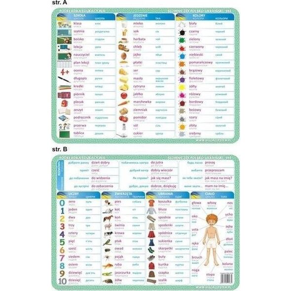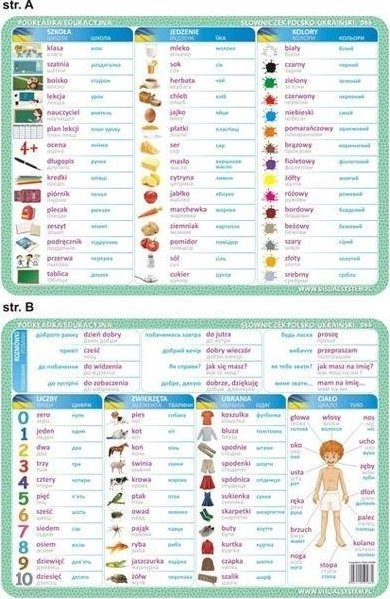 Εκπαιδευτικό μαξιλάρι σε μορφή Α3 για εκμάθηση βασικών λέξεων της πολωνικής γλώσσας στα ακόλουθα θέματα: o φράσεις o αριθμοί o ζώα o ρούχα o σώμα o σχολείο o φαγητό o χρώματα