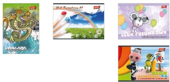 Το μπλοκ περιέχει 16 χρωματιστά φύλλα των 80 g/m2. Κάρτες βαμμένες στη μάζα σε κίτρινο, ροζ, πορτοκαλί, κόκκινο, ανοιχτό πράσινο, σκούρο πράσινο, ανοιχτό μπλε, σκούρο μπλε. Το κάλυμμα κιμωλίας με γραμμάριο 115 g/m2 χρησιμοποιεί τα πιο πρόσφατα μοτίβα σχεδίασης UNIPAP. Για να τονιστεί η ποιότητα του φινιρίσματος, το κάλυμμα γυαλίζεται επιπλέον. Το όλο πράγμα σκληραίνει με μια χάρτινη βάση. Το χρώμα εξωφύλλου αποστέλλεται τυχαία