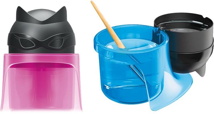 Κύπελλο νερού SUPERPOWER. Το σχήμα αναφέρεται στους χαρακτήρες των υπερηρώων από τα χρώματα SUPERPOWER. Διθάλαμος. Βολική αποθήκευση και συμπίεση της βούρτσας. Σταθερός. Αντιολισθητική βάση. Διατίθεται σε δύο χρωματικά σετ: ροζ-μαύρο και μπλε-μαύρο.