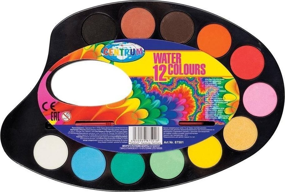 Ακουαρέλα για ζωγραφική σε χαρτί. Το σετ περιλαμβάνει 12 χρώματα βαφής. Η συσκευασία χρησιμεύει και ως παλέτα βαφής, διαμέτρου βαφής 30 mm{Color} Μίξη χρωμάτων. {Capacity [ml]} Δεν υπάρχουν διαθέσιμα δεδομένα. {Type} Ακουαρέλα