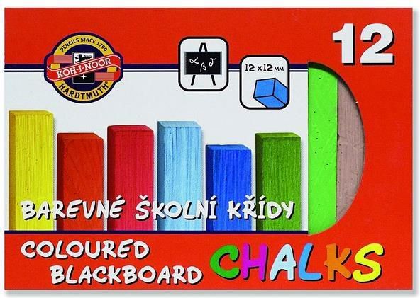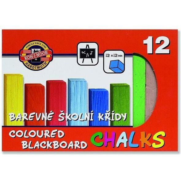 Χρωματιστή σχολική κιμωλία KOH-I-NOOR για μαυροπίνακες, σκονισμένη, μπλοκ 12x12 mm, μήκους 100 mm. Σετ 12 χρωμάτων κουτί, 15x10,5 cm{Χρώμα} Πολύχρωμο . {Ποσότητα} 12 τεμ.