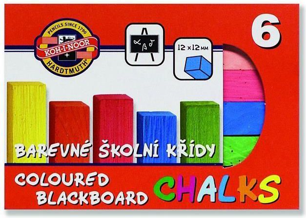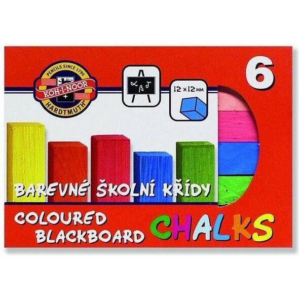 Χρωματιστή σχολική κιμωλία KOH-I-NOOR για μαυροπίνακες, σκονισμένη, μπλοκ 12x12 mm, μήκους 100 mm. Σετ 6 χρωμάτων κουτί, 11x7,5 cm