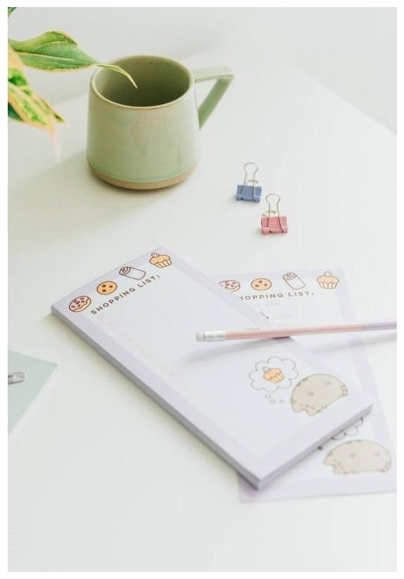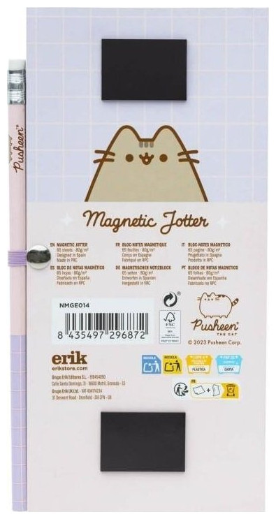 Notatnik z wizerunkiem kultowej kotki Pusheen z możliwością zamieszczenia na lodówce, świetnie sprawdzi się do codziennych zapisków i list zakupów. Dzięki dwóm dużym magnesom można go stabilnie umieścić w wygodnym miejscu. Do notatnika dołączono ołówek.Całość została wykonana z najwyższej jakości materiałów z dbałością o każdy szczegół.Cechy produktu:· Notatnik magnetyczny z kolekcji Pusheen Moments· Wymiary: 10 x 21 cm· W zestawie z ołówkiem· Gumka na ołówek· Dwa duże magnesy· Tekturowa podstawa· 65 łatwych do odrywania stron· Oficjalna licencja Pusheen