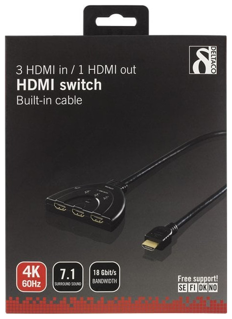 Deltaco DELTACO HDMI Switch, 3 inputs to 1 output, 4K at 60Hz, 0.5m cable, 7.1 audio, Ultra HD, juodas / HDMI-7044