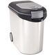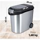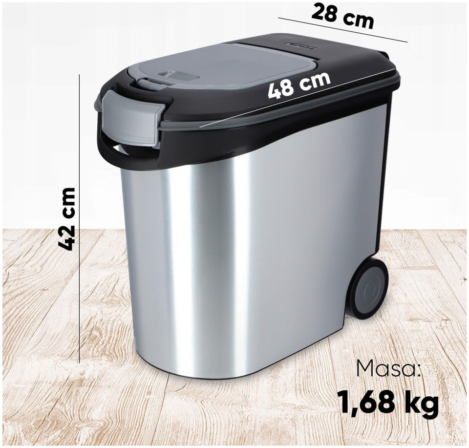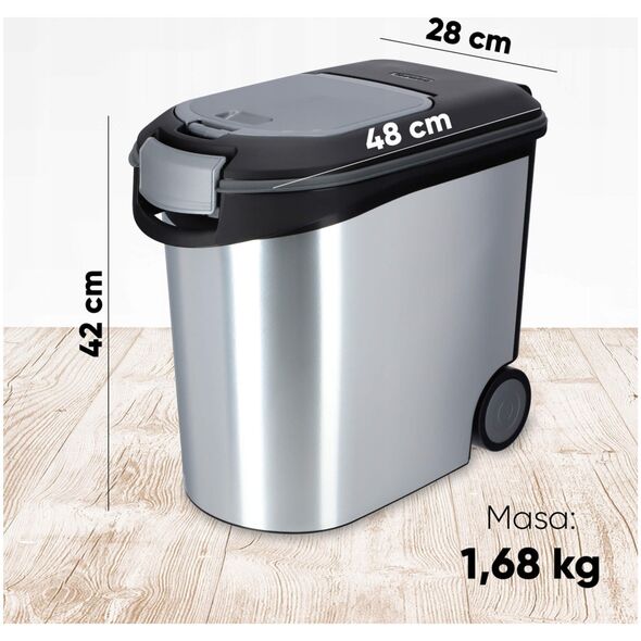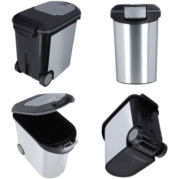 Το καπάκι ανοίγει και κλείνει γρήγορα, διευκολύνοντας το γέμισμα του δοχείου. Το δεύτερο, μικρότερο καπάκι χρησιμοποιείται για εύκολη δοσολογία φαγητού και σας επιτρέπει να αποφύγετε τη βοήθεια από ανυπόμονα μικρά παιδιά. Διαθέτει επίσης δυνατά χερούλια και στις δύο πλευρές, τα οποία θα σας φανούν χρήσιμα όταν γεμίζετε το μπολ με φαγητό. Εξοπλισμένο με ρόδες, το δοχείο μετακινείται εύκολα, καθιστώντας το όχι μόνο πρακτικό, αλλά και ελκυστικό χάρη στο κομψό, μεταλλικό του χρώμα.