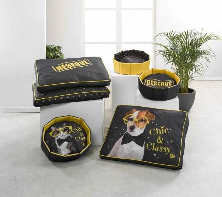 Homea Κρεβάτι για σκύλους και γάτες με αφαιρούμενο μαξιλάρι CHIC, Ø 48 cm, μπλε-κίτρινο με επιγραφή