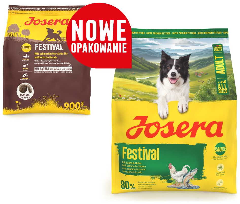 Josera Festival Karma Super Premium dla psów Wiek: Wielkość: Rozmiar granulki: ~1,83 cm Bezglutenowa receptura Smakowita propozycja dla każdego wybrednego dorosłego psa z wysoką zawartością mięsa Josera Festival Bezglutenowa karma dla wybrednych, dorosłych psów średnich i dużych ras Swoją wyjątkową smakowitość karma zawdzięcza granulkom otoczonym w pysznym sosie oraz dodatkowi łososia. Może być podawana w formie suchej oraz półwilgotnej.Kwasy tłuszczowe omega-3 i 6, witamina E i biotyna pomagają utrzymać zdrowy stan skóry i lśniącą sierść. Optymalny stosunek wapnia do fosforu oraz składniki takie jak mangan oraz miedź w łatwo przyswajalnej organicznej postaci dbają o mocne kości i stawy. Dostępne opakowania: 15 kg 5 x 900 g 900 g Korzyści karmy Pyszny sos Chrupiące granulki otoczone sosem sprawiają, że wybredne psy chętniej pobierają karmę. Może być podawana w postaci suchej i mokrej (po zalaniu wodą). Skóra i sierść Zdrowa skóra i lśniąca sierść to efekt wyważonej proporcji pomiędzy kwasami tłuszczowymi omega 3 i 6. Wspiera je witamina E, biotyna, metionina i najlepiej przyswajalne, organiczne formy cynku i miedzi. Budowa kości Optymalny stosunek wapnia do fosforu oraz składniki takie jak: witamina C, mangan oraz miedź w łatwo przyswajalnej organicznej postaci wzmacniają kościec psa oraz przyczyniają się do zachowania dobrego stanu chrząstek stawowych. Również dla psów aktywnych Dostarcza odpowiednią ilość energii dla aktywnych i sportowych psów. ZDROWY UKŁAD TRAWIENNY Receptura zawiera korzeń cykorii, naturalne źródlo inuliny - prebiotyku, który stymuluje wzrost korzystnej mikroflory jelit i reguluje pracę układu pokarmowego. WSPARCIE STAWÓW Dodatek suszonych małż zielonych (naturalne źródło chondoityny) wspiera prawidłową kondycję stawów. O nas Pasja do zwierząt, pierwszorzędna jakość i rozwiązania pełne troski o przyszłość środowiska: to właśnie te aspekty napędzają zespół Josera do działania. Jesteśmy producentem posiadającym 80-letnie doświadczenie w produkcji żywności. W naszej ofercie znajdziesz karmy dla psów i kotów, dostosowane do ich wieku, wielkości oraz do indywidualnych potrzeb żywieniowych. Kluczowym elementem składającym się na naszą jakość jest wybór naturalnych, zdrowych i wysokowartościowych składników. Ponadto nie stosujemy genetycznie zmodyfikowanych surowców. W celu uniknięcia alergii u zwierząt nasze karmy nie zawierają pszenicy i soi, jak również sztucznych barwników, aromatów oraz konserwantów. Neutralna dla klimatu Dzięki udoskonaleniom oraz działaniom proekologicznym nasza produkcja jest w 100% neutralna dla klimatu Bez sztucznych dodatków Nasze karmy nie zawierają pszenicy, soi oraz sztucznych barwników i konserwantów Nietestowana na zwierzętach Nasze karmy opracowujemy bez przeprowadzania testów na zwierzętach Bez GMO Do produkcji żadnego z naszych produktów nie stosujemy surowców zawierających GMO Skład karmy Pełnoporcjowa karma dla dorosłych psów. Skład: suszone białko drobiowe, kukurydza pełnoziarnista, ryż, tłuszcz drobiowy, wysłodki buraczane, suszony łosoś 4%, skrobia ziemniaczana, hydrolizowane białko drobiowe, hydrolizowane białko roślinne, minerały, suszona wątróbka drobiowa, drożdże, hemoglobina w proszku, suszony korzeń cykorii (naturalne źródło inuliny), suszone mięso nowozelandzkich małż zielonych (Perna canaliculus). Składniki analityczne Białko surowe % 26,0 Zawartość tłuszczu % 16,0 Włókno surowe % 3,0 Popiół surowy % 6,5 Wapń % 1,4 Fosfor % 1,0 Sód % 0,4 Magnez % 0,1 Energia metaboliczna kcal/kg 3819 Dodatki dietetyczne /kg Witamina A IU/kg 22600 Witamina D3 IU/kg 1700 Witamina E mg/kg 200 Witamina B1 mg/kg 15 Witamina B2 mg/kg 20 Witamina B6 mg/kg 20 Witamina B12 mcg/kg 100 Dodatki technologiczne: Przeciwutleniacze: bogate w tokoferol ekstrakty pochodzenia naturalnego Dodatki dietetyczne /kg D-pantotenian wapnia mg/kg 50 Niacyna mg/kg 85 Kwas foliowy mg/kg 5 Biotyna mcg/kg 950 Witamina C mg/kg 100 Żelazo (siarczan żelaza II, monohydrat) mg/kg 190 Cynk (uwodniony glicynowy chelat cynku) mg/kg 160 Mangan (tlenek manganu II) mg/kg 16 Miedź (glicynowy chelat miedzi II, hydrat) mg/kg 20 Jod (bezwodny jodan wapnia) mg/kg 2,0 Selen (selenin sodu) mg/kg 0,3 *Zalecana dawka dzienna dla psa. Porównaj nasze produkty Nazwa produktu Festival Optiness Lamm & Reis Lachs & Kartoffel Białko/Tłuszcz: 26/16 22/12 20/11 22/14 Wielkość rasy: Średnia i duża Duża i olbrzymia Mała i średnia Średnia i duża Rekomendacja: Karma dla psów wybrednych Lekkostrawna karma dla psów dużych ras Karma monobiałkowa Lekkostrawna, bezzbożowa z łososiem Wiek psa: Pies dorosły Pies dorosły Pies dorosły Pies dorosły Rodzaj mięsa: Drób i łosoś Drób i jagnięcina Jagnięcina Łosoś Bez zbóż: Bezglutenowa: W naszej ofercie znajdziesz również
