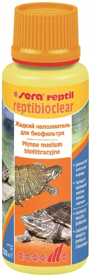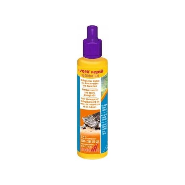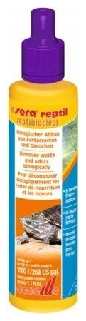 sera Reptibioclear 50 ml Οι υδρόβιες χελώνες και άλλα ερπετά που ζουν κυρίως στο νερό προκαλούν έντονη ρύπανση του νερού. Η πέψη τους είναι μια κοινή αιτία δυσάρεστων οσμών, τόσο στο ίδιο το ενυδρείο όσο και στο διαμέρισμα. Τη δυσάρεστη μυρωδιά βοηθά η υψηλή θερμοκρασία του αέρα στο aquaterrarium. Το sera reptibioclear εγγυάται άμεση και αποτελεσματική βοήθεια. .Sera Reptibioclear 50ml - καθαρίζει το νερό στο terrarium. Οι μοναδικοί μικροοργανισμοί που περιέχονται στο sera reptibioclear υποστηρίζουν τη φυσική αποσύνθεση οργανικών αποβλήτων, υπολειμμάτων τροφίμων και αποτρέπουν τις δυσάρεστες οσμές. Εφαρμογή: Ανακινήστε πριν τη χρήση! Δύο φορές την εβδομάδα, ρίξτε 2 ml Sera Reptibioclear ανά 40 λίτρα νερού, καθώς και σε κάθε αλλαγή νερού και ως συμπλήρωμα σε ένα λειτουργικό σύστημα φίλτρου. Αυτό το βιολογικά πολύ αποτελεσματικό προϊόν πρέπει να προστεθεί στο φίλτρο ή απευθείας στο νερό. .