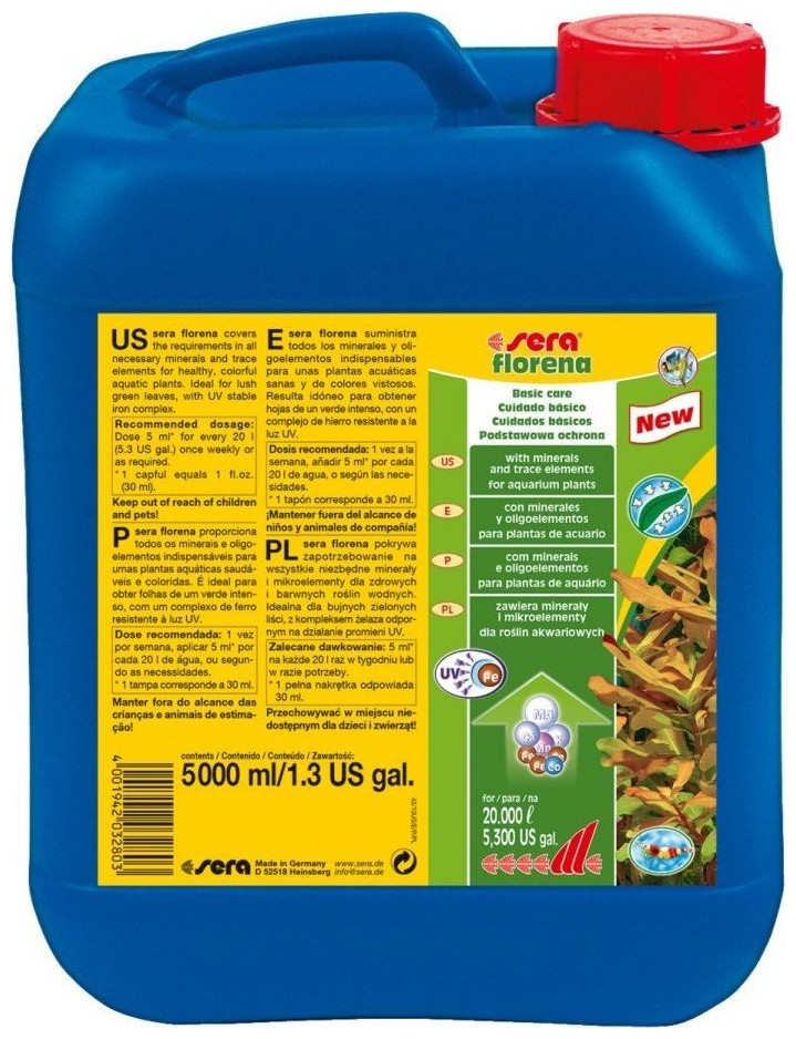 Υγρό προϊόν περιποίησης για όμορφα φυτά ενυδρείου Βασική προστασία Περιέχει μέταλλα και ιχνοστοιχεία Αντοχή στην υπεριώδη ακτινοβολία Για φυτά ενυδρείου Τοsera florena είναι ένα ιδανικό προϊόν φροντίδας για υδρόβια φυτά που λαμβάνουν θρεπτικά συστατικά κυρίως μέσω των φύλλων τους. Τα υδρόβια φυτά παίζουν πολύ σημαντικό ρόλο στα ενυδρεία γιατί απομακρύνουν τους ρύπους και τα θρεπτικά συστατικά που είναι κατάλληλα για τα φύκια από το νερό. Η sera florena παρέχει στα υδρόβια φυτά όλα τα απαραίτητα μέταλλα και ιχνοστοιχεία για υγιή και πολύχρωμη ανάπτυξη, ώστε να μπορούν να εκπληρώσουν τον σημαντικό ρόλο τους. Αποτρέπει τις ελλείψεις χωρίς την ανάγκη υπερφόρτωσης του νερού με υπερβολικές ποσότητες θρεπτικών συστατικών. Επιπλέον, η νέα βελτιωμένη φόρμουλα περιέχει καινοτόμα, εξαιρετικά σταθερά σύμπλοκα σιδήρου που παραμένουν διαθέσιμα ακόμη και όταν χρησιμοποιείτε λάμπα UV-C κατά τη διάρκεια της ημέρας. Αυτό το προϊόν δεν περιέχει νιτρικά ή φωσφορικά άλατα. Είναι καλά ανεκτό από όλα τα ασπόνδυλα. Ο συνδυασμός τυριού florena και cheese florenette είναι απόλυτα ισορροπημένος και ικανοποιεί όλες τις απαιτήσεις διαφόρων ειδών υδρόβιων φυτών.