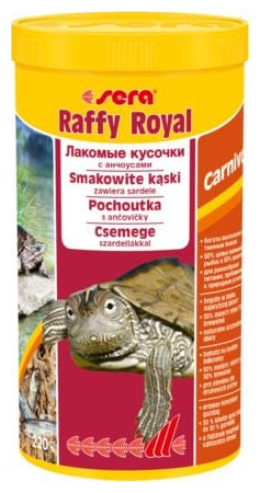 Το sera Raffy Royal είναι μια λιχουδιά τόσο για υδρόβιες χελώνες όσο και για άλλα μεγαλύτερα σαρκοφάγα ερπετά, αμφίβια και μεγάλα αρπακτικά διακοσμητικά ψάρια. Αποτελείται από φυσικά, απαλά αποξηραμένα ψάρια (50%) και γαρίδες (50%).
