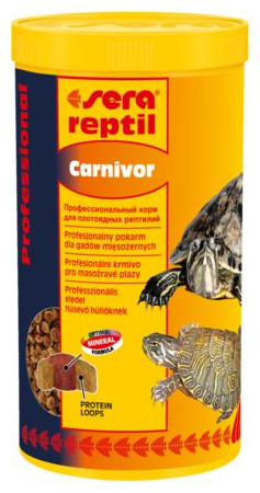 Το sera reptil Professional Carnivor είναι μια συμπληρωματική τροφή για όλα τα σαρκοφάγα ερπετά όπως οι υδρόβιες χελώνες, που αποτελείται από επιπλέοντα δίχρωμα κόκκους που παράγονται με ειδική διαδικασία συνεξώθησης.