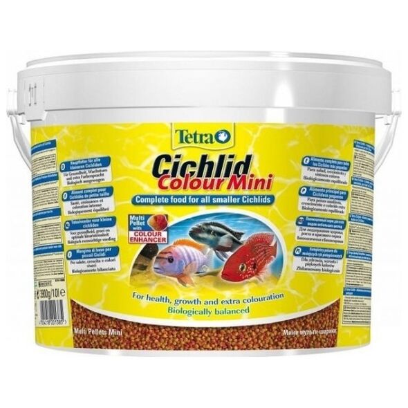 Tetra Cichlid Colour Mini Kompletny pokarm dla mniejszych ryb pielęgnicowatych. Bogaty w wysokiej jakości białka i inne składniki odżywcze, aby spełnić wymagania żywieniowe pielęgnic Nowa formuła Multi Pellet zawiera naturalne substancje wybarwiające, które intensyfikują wybarwienie wszystkich czerwonych, pomarańczowych i żółtych ryb tropikalnych Stworzony przede wszystkim dla wszystko- i mięsożernych ryb pielęgnicowatych Niewielkie rozmiary odpowiednie dla małych pielęgnic Z formułą BioActive dla długiego życia i wspaniałego samopoczucia ryb