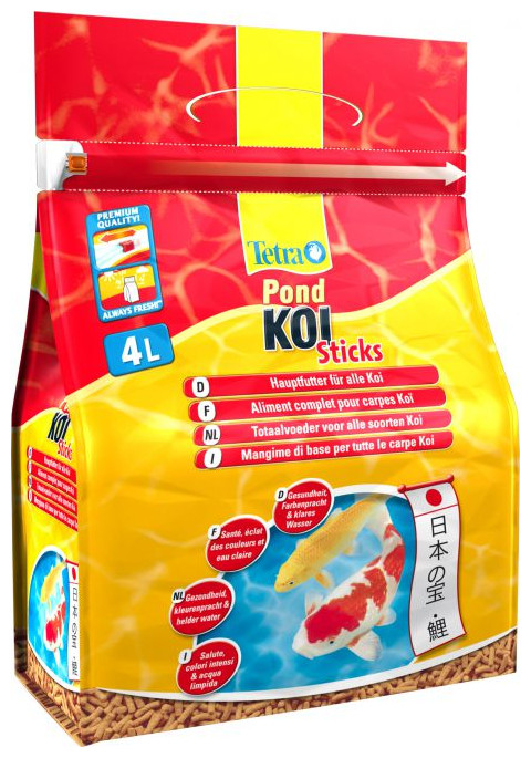 Tetra Pond Koi Sticks Wysokiej jakości pokarm podstawowy opracowany specjalnie dla karpi Koi, w postaci pływających po powierzchni wody pałeczek. Zawiera wszystkie niezbędne składniki odżywcze, witaminy oraz mikroelementy Naturalne substancje wybarwiające (wysokiej jakości karotenoidy) w naturalny sposób podkreślają czerwone, żółte i pomarańczowe pigmenty w ubarwieniu ryb Pokarm jest lekkostrawny i w pełni wykorzystywany przez ryby, co zapobiega zanieczyszczeniu wody Pokarm jest dostępny w szczelnie zamykanych torbach wykonanych z wysokiej jakości plastiku, który zapewnia ochronę przed szkodliwym działaniem światła słonecznego, powietrza i wilgoci. Pokarm zachowuje wszystkie ważne składniki odżywcze oraz świeżość