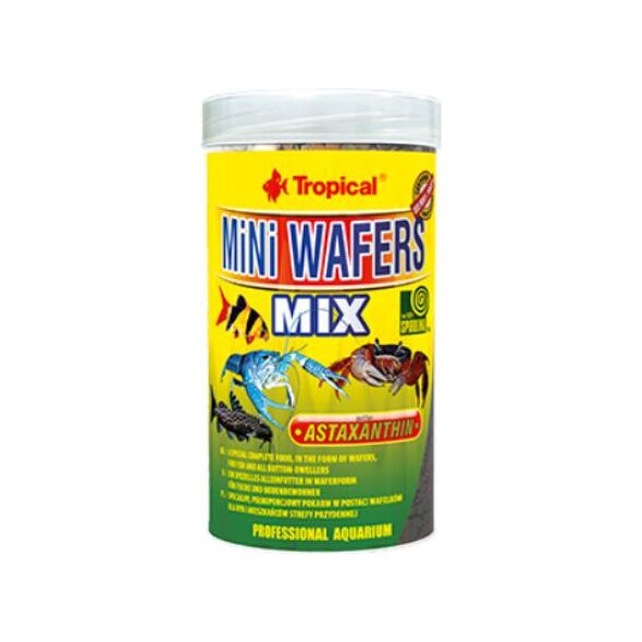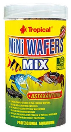 ΜΙΝΙ ΓΚΟΦΡΕΣ ΜΙΞΤΕ βυθιζόμενες γκοφρέτες με ασταξανθίνη και σπιρουλίνα για ψάρια βυθού και καρκινοειδή. Τροφή πολλαπλών συστατικών σε μορφή μικρών γκοφρετών, σε κόκκινο και πράσινο χρώμα, που προορίζεται για την καθημερινή σίτιση παμφάγων ψαριών που τρέφονται στη ζώνη του βυθού, π.χ. Οι κόκκινες γκοφρέτες είναι πηγή φυσικής ασταξανθίνης και βήτα-γλυκάνης - ένας ισχυρός ανοσοδιεγέρτης που αυξάνει την αντίσταση των ψαριών στις ασθένειες. Οι πράσινες γκοφρέτες περιέχουν σπιρουλίνα και φυτικές ίνες, οι οποίες ρυθμίζουν την πέψη. Οι γκοφρέτες χαρακτηρίζονται από υψηλή υδροσταθερότητα - όταν απορροφώνται από το νερό, διατηρούν τη δομή τους και δεν καταρρέουν, γεγονός που διευκολύνει τη διατροφή των καρκινοειδών και επιτρέπει παρόμοια διατροφική συμπεριφορά στα ψάρια, των οποίων το στόμα μετατρέπεται σε βεντούζα εξοπλισμένη με δόντια που χρησιμοποιούνται για σκουπίστε τα τρόφιμα από σκληρές επιφάνειες.