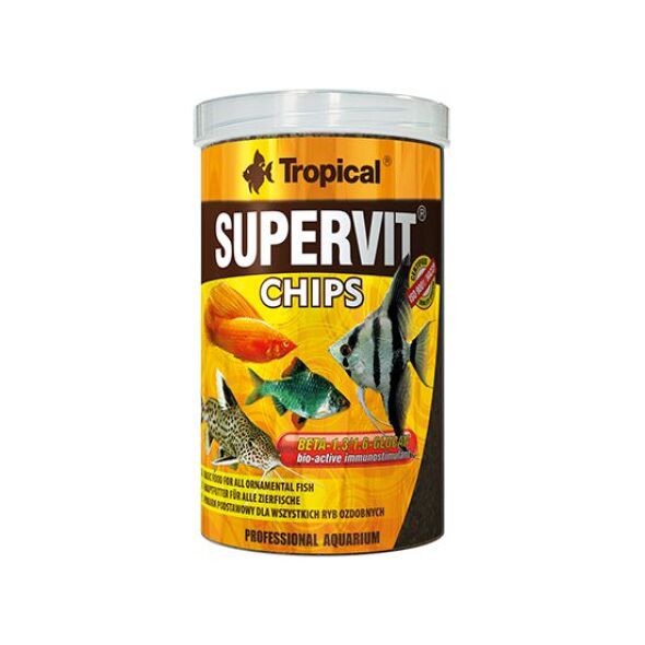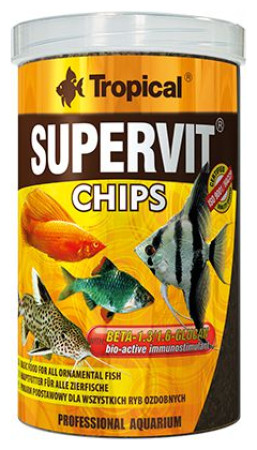 Τρόφιμα πολλαπλών συστατικών SUPERVIT CHIPS σε μορφή τσιπς με βήτα-γλυκάνη. Το SUPERVIT CHIPS είναι μια τροφή πολλαπλών συστατικών με τη μορφή τσιπς, που προορίζεται για την καθημερινή σίτιση των περισσότερων ειδών παμφάγων ψαριών που λαμβάνουν τροφή από τη στήλη του νερού ή τον πυθμένα του ενυδρείου. Οι διατροφικές και ενεργειακές ανάγκες των ψαριών καλύπτονται από μια εξαιρετικά πλούσια συνταγή, η οποία αποτελείται από αρκετές δεκάδες επιλεγμένα συστατικά της υψηλότερης ποιότητας, όπως καρκινοειδή, μαλάκια και φύκια. Το ανοσοποιητικό σύστημα των ψαριών στην καταπολέμηση των παθογόνων υποστηρίζεται από βήτα-γλυκάνη και σταθεροποιημένη βιταμίνη C. Η πλούσια σύνθεση των κόκκων SUPERVIT το καθιστά ιδιαίτερα χρήσιμο σε δημοφιλή ενυδρεία πολλαπλών ειδών, όπου αποτελεί τη βάση της διατροφής, συμπληρωμένο όπως απαιτείται με φυτικές και πλούσιες σε πρωτεΐνες τροφές.