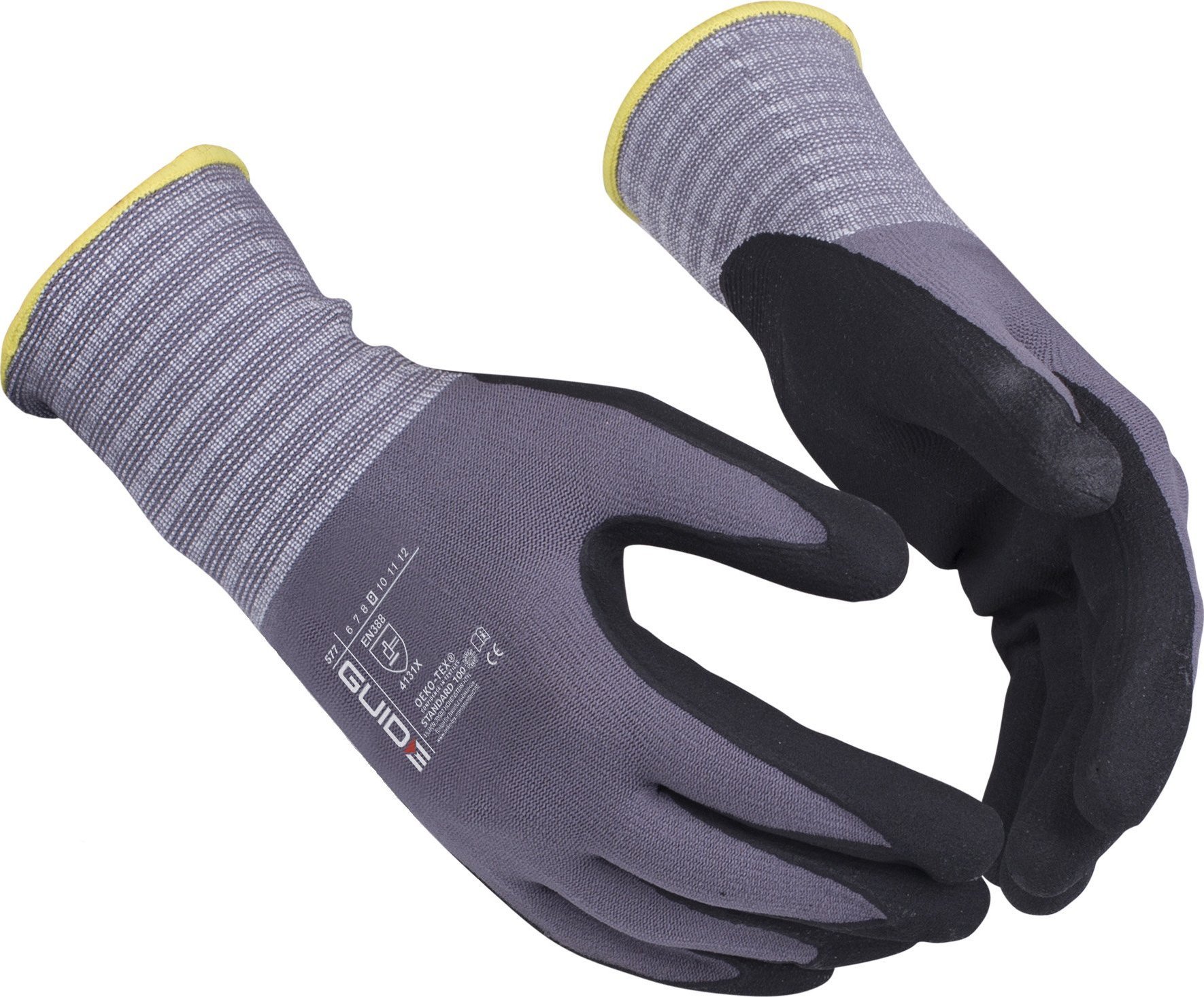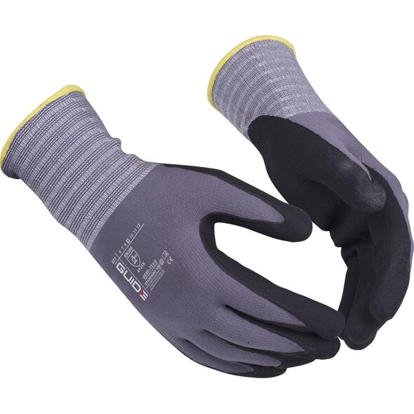Γάντια εργασίας επικαλυμμένα με νιτρίλιο GUIDE 577 μέγεθος 9 Κωδικός προϊόντος: 223546575 Κατασκευαστής: GUIDE Περιγραφή: Λεπτά γάντια εργασίας με παλάμη επικαλυμμένη με νιτρίλιο, μικροαφρό που εξασφαλίζει πολύ καλό κράτημα στο στεγνό και φράγμα υγρασίας. Εγκεκριμένο για επίπεδο θερμότητας επαφής 1. Πιστοποίηση Oeko-Tex. Συμβατό με το πιστοποιητικό Öko-Tex Αφρός νιτριλίου Επίπεδο θερμότητας επαφής 1{Σκοπός} Κατασκευή . {Type}Επικάλυψη