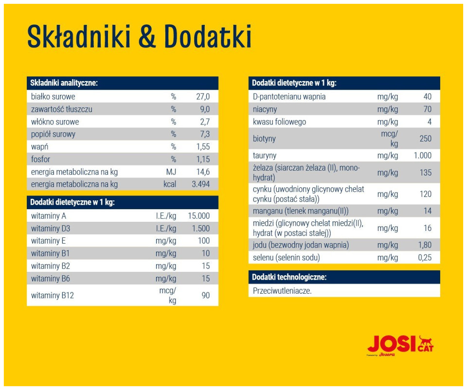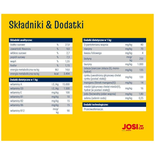 Αναλυτικά συστατικά: ακατέργαστη πρωτεΐνη 27,0%; περιεκτικότητα σε λιπαρά 9,0%; ακατέργαστες ίνες 2,7%; ακατέργαστη τέφρα 7,3%; ασβέστιο 1,55%; φώσφορος 1,15%.{Age} Ενήλικες γάτες (1+) . {Γεύση} Με πάπια. {Dedicated to races} Universal. {Καθαρό βάρος} 18 κιλά . {Χαρακτηριστικά} Για όλες τις γάτες