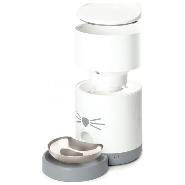 Έξυπνος τροφοδότης Catit Pixi Σε αντίθεση με το Smart Fountain, είναι ένα αυτόνομο προϊόν. Έχει την ίδια συνδεσιμότητα Wi-Fi με το Fountain και συνδέεται στην ίδια εφαρμογή. Ο τροφοδότης είναι εξοπλισμένος με χοάνη ABS χωρητικότητας 2,8 λίτρων και χωράει περίπου 1-1,2 κιλά ξηρής τροφής για γάτες (ανάλογα με τη συνταγή/μάρκα). Το μπροστινό μέρος του διανομέα είναι ένα κουμπί που, όταν πατηθεί, θα διανείμει τα τρόφιμα στο ανοξείδωτο μπολ από κάτω. Όταν το καπάκι είναι κλειστό, η χοάνη σφραγίζεται ερμητικά, αλλά κάτω από το επάνω καπάκι υπάρχει ένα καλάθι για ένα αποξηραντικό (πυρίτιο) που θα σας βοηθήσει να διατηρήσετε τα τρόφιμα φρέσκα.