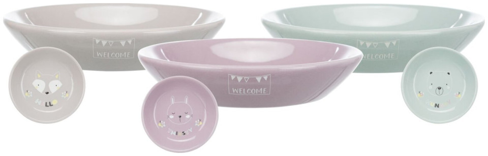 Το Trixie Ceramic Bowl Junior 0,2l 14cm είναι ένα κεραμικό μπολ για μικρά ζώα. Ένα μπολ για ένα μικρό σκύλο, γάτα ή τρωκτικό. Διατίθεται σε εκδόσεις μέντα, ροζ και γκρι. Κάθε ένα από αυτά περιέχει την εικόνα ενός διαφορετικού ζώου. Στην άκρη του μπολ υπάρχει μια επιγραφή "καλώς ήρθατε". Διαφορετικά, θα στείλουμε μια τυχαία Διάσταση: διάμετρος 14 cm