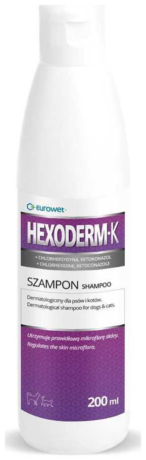 Το Hexoderm-K είναι ένα κτηνιατρικό δερμοκαλλυντικό που ρυθμίζει τη μικροχλωρίδα του δέρματος, σταθεροποιεί το pH του και αποτρέπει την ξήρανση αφήνοντας ένα λεπτό λιπαρό και πρωτεϊνικό στρώμα. Η χλωρεξιδίνη και η κετοκοναζόλη καταπολεμούν τους επιβλαβείς μικροοργανισμούς (βακτήρια, ζυμομύκητες και δερματόφυτα) που προκαλούν μια σειρά από δερματικές παθήσεις. Τα ήπια καθαριστικά που περιέχονται στο υγρό επιτρέπουν τη συχνή χρήση του. Χρήση ως στοιχείο περιποίησης καθ' όλη τη διάρκεια της σωστής θεραπείας της φλεγμονής του δέρματος.