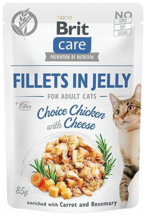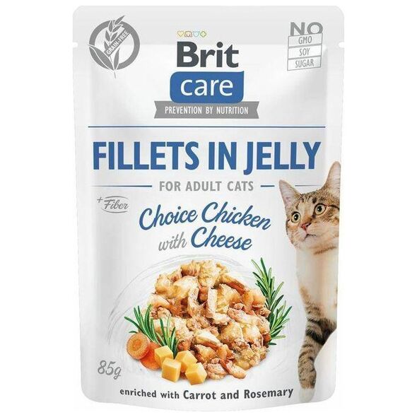 Brit Care Pouch Filets σε Ζελέ Κοτόπουλο με τυρί εμπλουτισμένο με Καρότο & Δεντρολίβανο Πλήρης, υγρή τροφή χωρίς δημητριακά, Super Premium για ενήλικες γάτες ΣΥΝΘΕΣΗ: φιλέτο κρέατος 82% (67% κοτόπουλο, 15% συκώτι), ζωμός, 3. % τυρί, 3% καρότο, 0,5% δεντρολίβανο, μέταλλα, άμυλο μπιζελιού ΑΝΑΛΥΤΙΚΑ ΣΥΣΤΑΤΙΚΑ: ακατέργαστη πρωτεΐνη 8,5%, ακατέργαστο λίπος 4,0%, ακατέργαστες φυτικές ίνες 0,5%, ακατέργαστη τέφρα 2,0%, υγρασία 82,0%, ασβέστιο 0,25%, φώσφορος 0,2%, νάτριο 0,3%. 3a700) 150 mg, βιοτίνη (3a880) 0,5 mg, ψευδάργυρος (3b606) 12 mg, μαγγάνιο (3b504) 3 mg, σίδηρος (3b103) 10 mg, χαλκός (3b406) 0,4 mg, ιώδιο (3b201) 0,70 mg (3b201) 303 mg, ταυρίνη mg.ΕΝΕΡΓΕΙΑ ΜΕΤΑΒΟΛΙΚΟΣ: 820 kcal/kg.{Age} Ενήλικες γάτες (1+) . {Γεύση} Με κοτόπουλο. {Καθαρό βάρος} 85 g . {Race} Όλα . {Γεύση} Με τυρί. Φακελάκια {Packaging}
