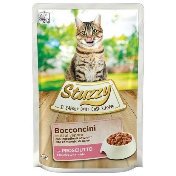 Stuzzy (γάτα) - φακελάκι Bocconcini 85 g - με ζαμπόν. Πλήρης τροφή για ενήλικες γάτες με ζαμπόν στον ατμό. Δεν περιέχει συντηρητικά και χρωστικές ουσίες. Υποστηρίζει την προστασία των κυττάρων και του ανοσοποιητικού συστήματος, θρέφει το δέρμα και υποστηρίζει την καρδιά Συστατικά: 45% κρέας και ζωικά προϊόντα (8% ζαμπόν), φυτικά προϊόντα (0,4% ινουλίνη κιχωρίου), μέταλλα. Πρόσθετα/kg: βιτ. D3 200 IU, βιτ. E 100 IU, βιοτίνη 100 μg, ταυρίνη 100 mg, Zn (μονοένυδρος θειικός ψευδάργυρος) 20 mg, Mn (μονοένυδρο θειικό μαγγάνιο) 3 mg Αναλυτική σύνθεση: πρωτεΐνη 7,5%, ακατέργαστες φυτικές ίνες 0,3%, ακατέργαστο λίπος 4%, ακατέργαστη τέφρα 1. Υγρασία 82% Προτεινόμενη διατροφή: 1 φακελάκι ανά γεύμα. Μια ενήλικη γάτα (περίπου 4 κιλά) χρειάζεται 3-4 φακελάκια την ημέρα. Σερβίρετε σε θερμοκρασία δωματίου. Αποθηκεύστε τα αχρησιμοποίητα τρόφιμα στο ψυγείο και χρησιμοποιήστε τα μέσα σε 24-48 ώρες από το άνοιγμα{Age} Ενήλικες γάτες (1+) . {Καθαρό βάρος} 85 g . {Race} Όλα . {Γεύση} Με ζαμπόν. Φακελάκια {Packaging}