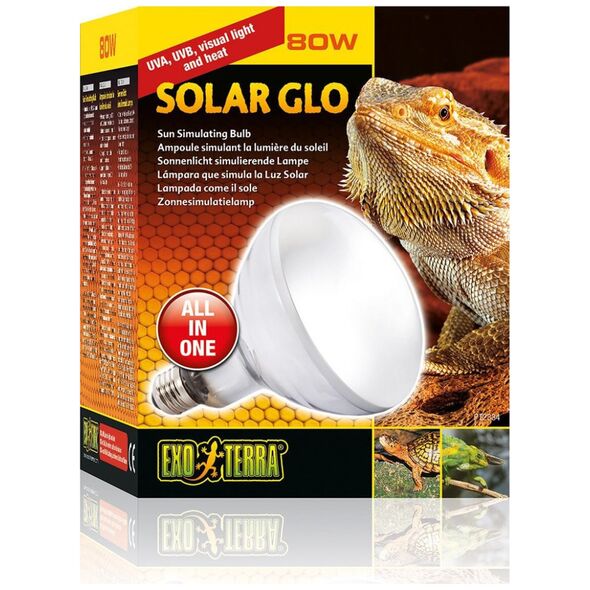 Επαγγελματικός λαμπτήρας που μιμείται την ηλιακή ακτινοβολία. Υψηλής ποιότητας λαμπτήρας πυρακτώσεως υδραργύρου που δεν απαιτεί ballast. Τις περισσότερες φορές επιλέγεται από επαγγελματίες καλλιεργητές επειδή παρέχει ισορροπημένα επίπεδα υπεριώδους ακτινοβολίας (συμπεριλαμβανομένων των UVA και UVB), υπέρυθρων (θερμότητας) και ορατού φωτός σε έναν εύκολο στην εγκατάσταση λαμπτήρα. Το Solar Glo παρέχει τις ιδιότητες του φυσικού ηλιακού φωτός, το οποίο είναι μια από τις πιο σημαντικές πτυχές της διατήρησης της υγείας των ερπετών. Είναι ένας λαμπτήρας πλήρους φάσματος με προσεκτικά επιλεγμένες κορυφές που εξασφαλίζουν όρεξη, δραστηριότητα, ζωηρά χρώματα και βέλτιστη απορρόφηση ασβεστίου μέσω της παραγωγής της βιταμίνης D3.