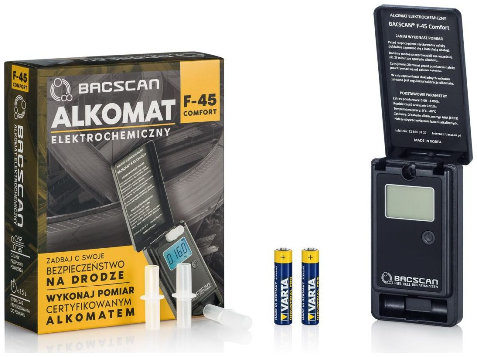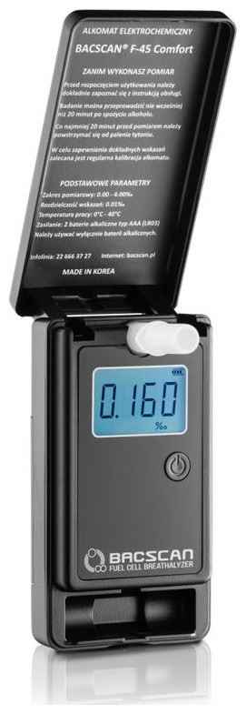 Το μοντέλο F-45 Comfort είναι ένα υψηλής ποιότητας αλκοτέστ που βασίζεται σε ηλεκτροχημικό αισθητήρα πλατίνας. Χαρακτηρίζεται από μικρές διαστάσεις, καθιστώντας το μια εύχρηστη συσκευή που μπορείτε να έχετε πάντα μαζί σας. Ο αισθητήρας ανταποκρίνεται μόνο στην αιθυλική αλκοόλη, επομένως δεν υπάρχει πιθανότητα τα αποτελέσματα να παραμορφωθούν από άλλες ουσίες. Η συσκευή διαθέτει δίχρωμη οθόνη LCD που δείχνει το αποτέλεσμα μέτρησης στην περιοχή από 0 έως 4 ανά χιλιόμετρο, με ακρίβεια δύο δεκαδικών ψηφίων.