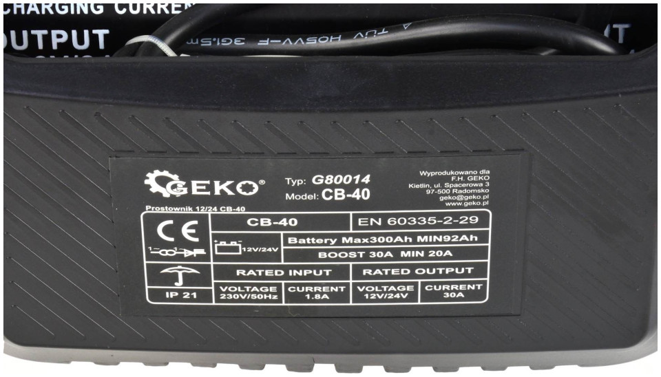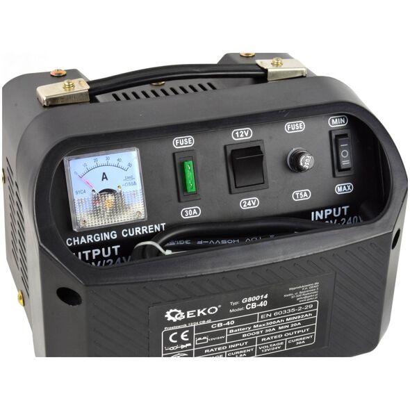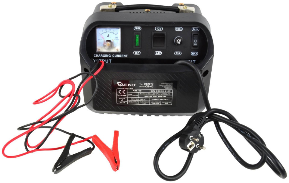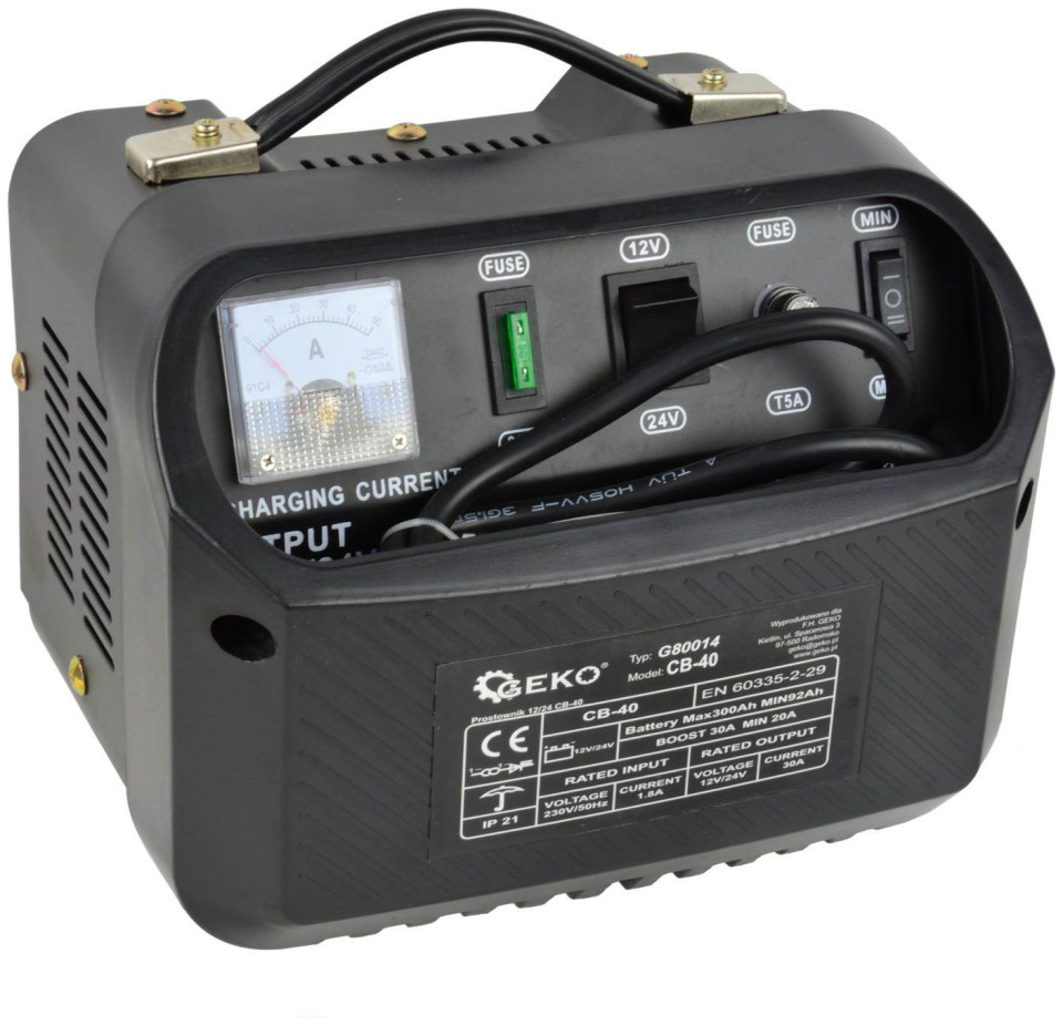 Φορτιστής αυτοκινήτου 12/24V CB-40 Ο φορτιστής αυτοκινήτου CB-40 έχει σχεδιαστεί για τη φόρτιση μπαταριών μολύβδου-οξέος (STD) με τάση 12V ή 24V, που χρησιμοποιούνται, μεταξύ άλλων, σε επιβατικά αυτοκίνητα, φορτηγά, φορτηγά κ.λπ. Διαθέτει ενσωματωμένη ασφάλεια που προστατεύει τη συσκευή από λανθασμένη σύνδεση πολικότητας και βραχυκύκλωμα. Χαρακτηριστικά προϊόντος: προσεκτικά κατασκευασμένη εργονομική λαβή μεταφοράς έχει ενσωματωμένη ασφάλεια UNI 30A και ασφάλεια 5Α φορτίζει μπαταρίες χωρητικότητας 92 έως 300 Ah Τάση φόρτισης 12V / 24V Τεχνικές προδιαγραφές: Τάση τροφοδοσίας: 230V / 2 volt / φόρτιση: 50 Hz: 24V Ρεύμα φόρτισης: 20A – 30A Υποστηριζόμενη χωρητικότητα μπαταρίες: 92 - 300 Ah Επίπεδο προστασίας: IP 21 Προστασία: 30A ασφάλεια τύπου UNI, ασφάλεια 5A Εξοπλισμός: καλώδια βραχυκυκλωτήρα, 2x ασφάλεια τύπου UNI, 2x ασφάλεια{Weight [kg]} Δεν υπάρχουν διαθέσιμα δεδομένα. {Weight [kg]} Δεν υπάρχουν διαθέσιμα δεδομένα. {Weight [kg]} Δεν υπάρχουν διαθέσιμα δεδομένα. {Weight [kg]} Δεν υπάρχουν διαθέσιμα δεδομένα. {Weight [kg]} Δεν υπάρχουν διαθέσιμα δεδομένα
