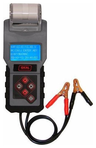 Ψηφιακός ελεγκτής με εκτυπωτή που προορίζεται για μπαταρίες μολύβδου, σας επιτρέπει να επαληθεύσετε: την κατάσταση φόρτισης της μπαταρίας και τη δυνατότητα εκκίνησης μπαταριών μολύβδου 12 V που χρησιμοποιούνται σε οχήματα (BATTERY TEST) τη λειτουργία του συστήματος εκκίνησης του οχήματος (STARTING TEST) τη λειτουργία της φόρτισης κύκλωμα στο όχημα (ΔΟΚΙΜΗ ΕΝΑΛΛΑΚΤΗ) Οι χαμηλότερες και οι υψηλότερες τιμές ρεύματος εκκίνησης (CCA) που μπορούν να ελεγχθούν: EN: 50 - 1400 A IEC: 50 - 800 A DIN: 50 - 800 A SAE: 50 - 1400 A Η θερμοκρασία περιβάλλοντος που επιτρέπει τη σωστή χρήση του ελεγκτή είναι μεταξύ -18°C και 55°C. Επιλογή του προτύπου μπαταρίας: EN, JIS, DIN, IEC, SAE Το αποτέλεσμα του BATTERY TEST είναι η τιμή του πραγματικού ρεύματος εκκίνησης: BATTERY OK BATTERY USED REPLACE BATTERY BATTERY OK - CHARGE Η τιμή της τάσης της μπαταρίας δίνεται ως αποτέλεσμα της ΔΟΚΙΜΗ ΕΝΑΛΛΑΚΤΗ: ΕΝΑΛΛΑΚΤΗΣ ΟΚ ΕΠΙΣΚΕΥΗ ΔΟΚΙΜΗ ΕΝΑΛΛΑΚΤΗ ΕΚΚΙΝΗΣΗ, δίνεται η τιμή της χαμηλότερης τάσης μπαταρίας που λήφθηκε κατά την εκκίνηση: ΛΕΙΤΟΥΡΓΙΑ ΕΠΙΣΚΕΥΗΣ ΕΚΚΙΝΗΣΗΣ Η επιλογή του τύπου δοκιμής είναι πολύ απλή και τα αποτελέσματα δεν απαιτούν ερμηνεία από το άτομο που συνεργάζεται με τον ελεγκτή. Ο ελεγκτής τροφοδοτείται από την τάση από τη δοκιμασμένη μπαταρία και διαθέτει επίσης μπαταρία 9V για τη διατήρηση της ημερομηνίας και της ώρας. Ο ελεγκτής είναι κατασκευασμένος από ανθεκτικό στην κρούση υλικό ABS. ...